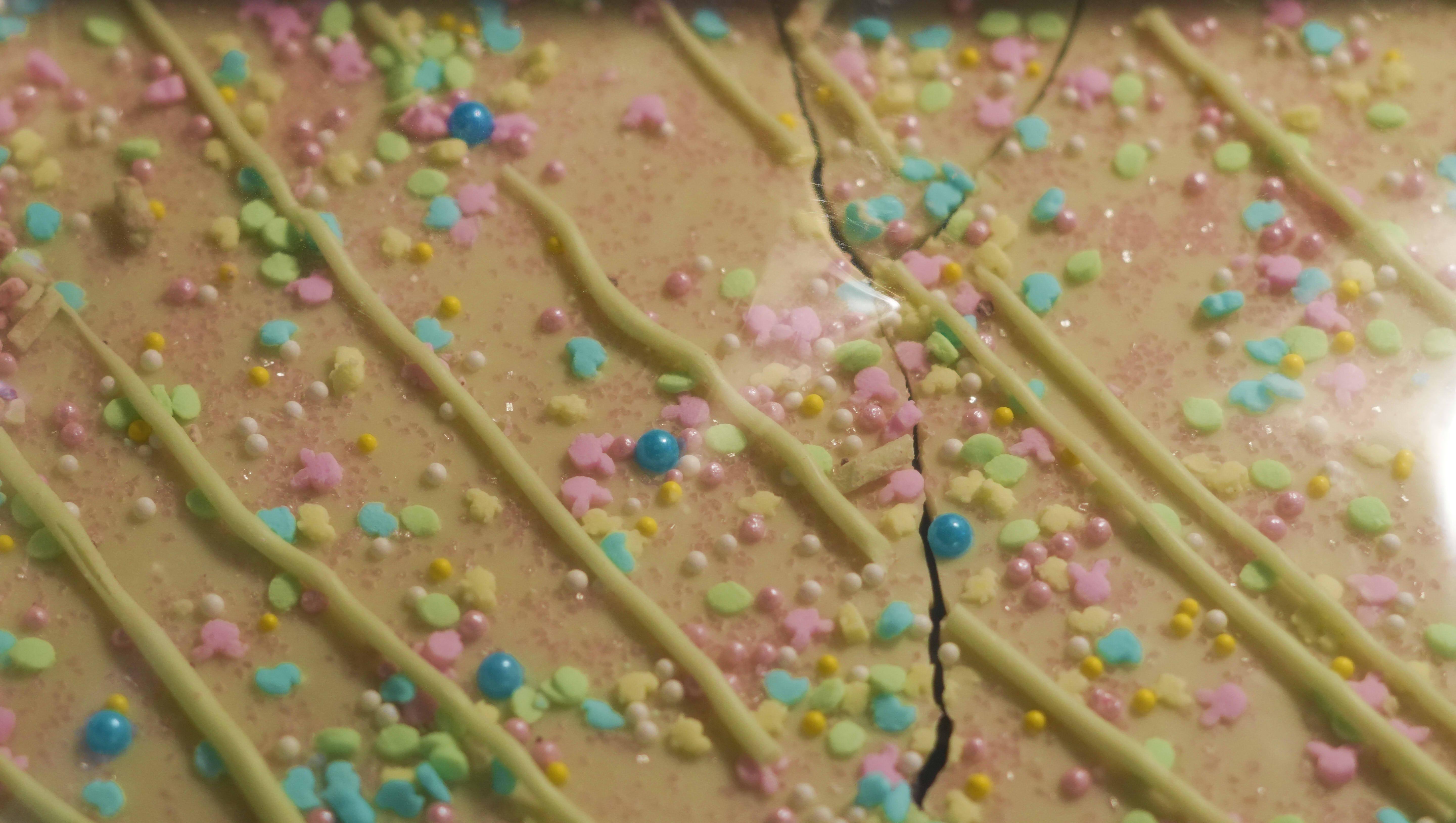 I love cute sweets so much. I couldn't resist this chocolate. It's called bunny bark. Look at all the cute sprinkles. The texture and color is mesmerizing.